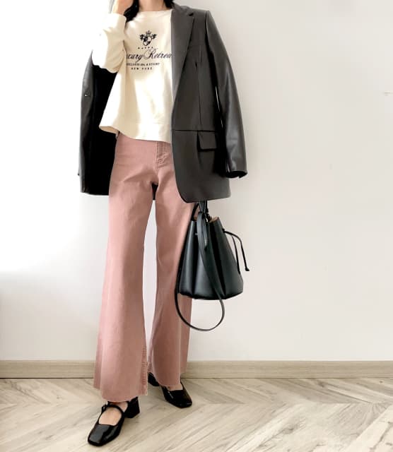 - ピンク×グレー: 淡いグレーのスウェットやTシャツと合わせると、甘さが抑えられ、バランスの取れた大人カジュアルな着こなしになります。